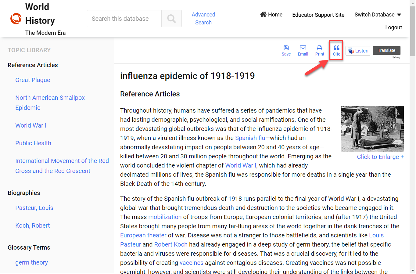 To use the citation export feature from an ABC-CLIO database, open the NoodleTools project you wish to work with in one browser tab. In a second tab, open the ABC-CLIO database and locate the Cite button at the top-right of the article you wish to use, as pictured.