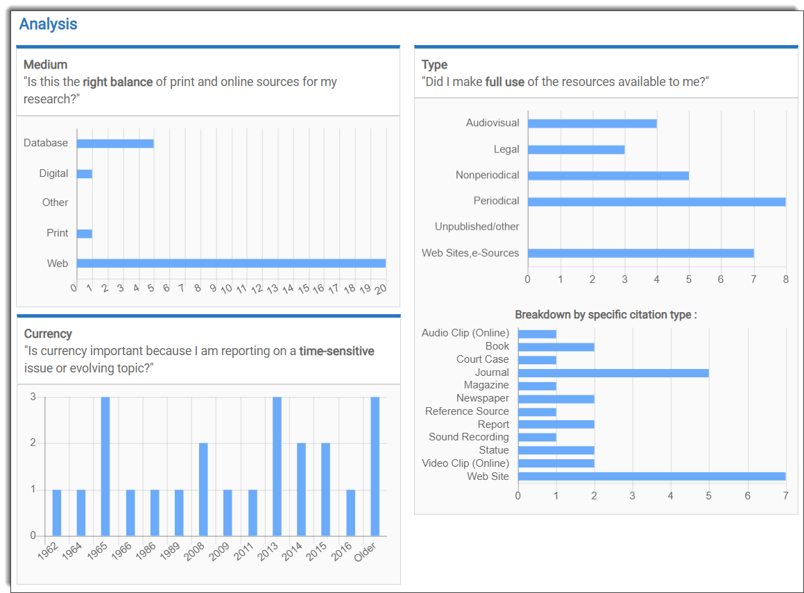 - Source analysis. View charts detailing the variety and currency of source types used in your research.