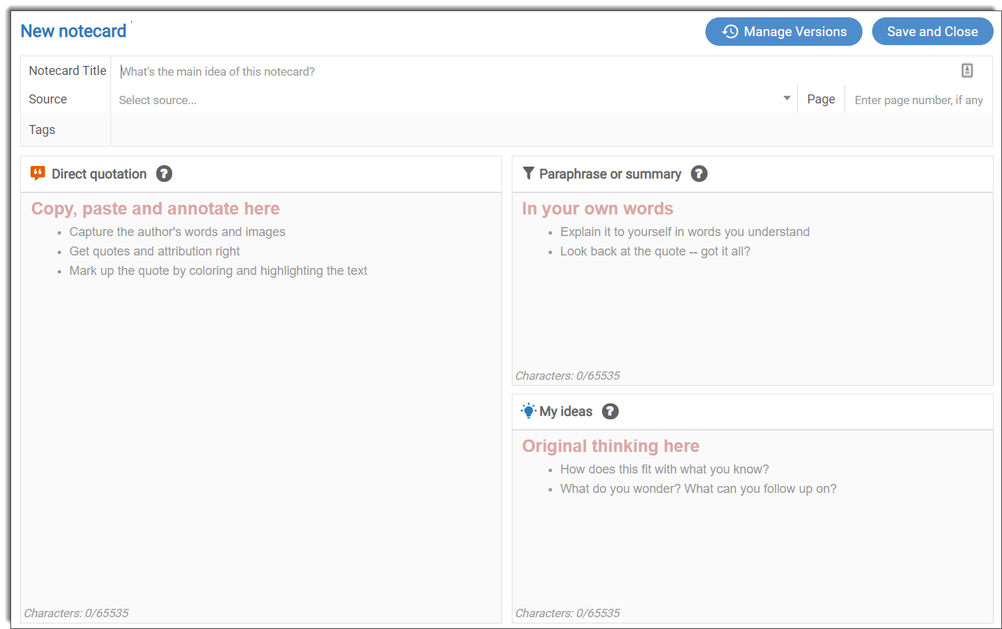 - Direct Quotation: Store source material for future reference. Highlight and annotate to ensure close reading.