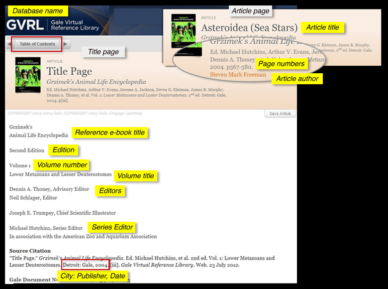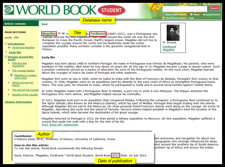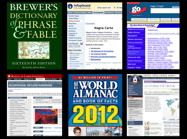 A reference source (print or online) is organized for quick access (e.g., alphabetically, by date, by geographic region) to brief information, statistics or maps.