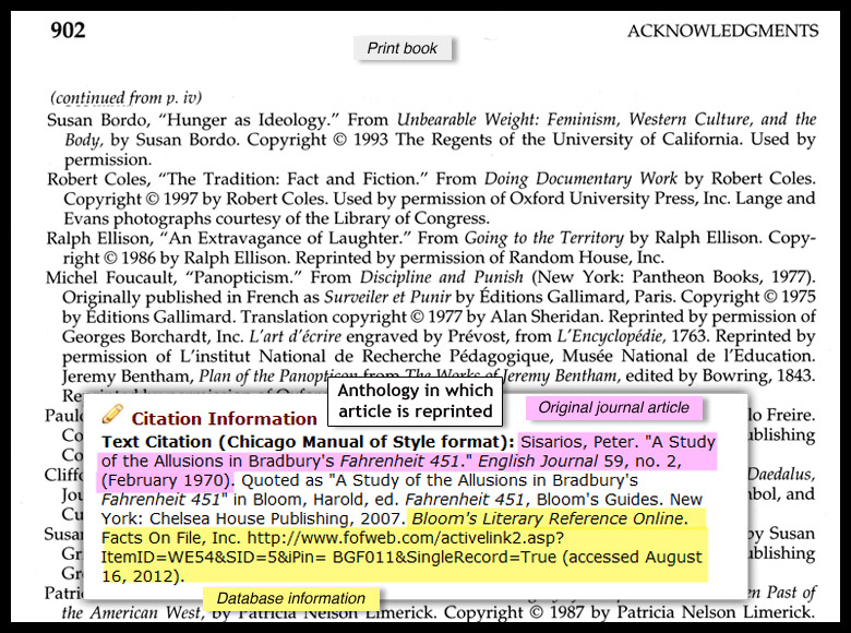 - In"Permissions," "Acknowledgements" or "Credits" in a print anthology