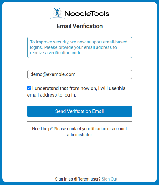 - Email addresses are unique, allowing teachers, school admins, and the NoodleTools support team to accurately identify a user as necessary.