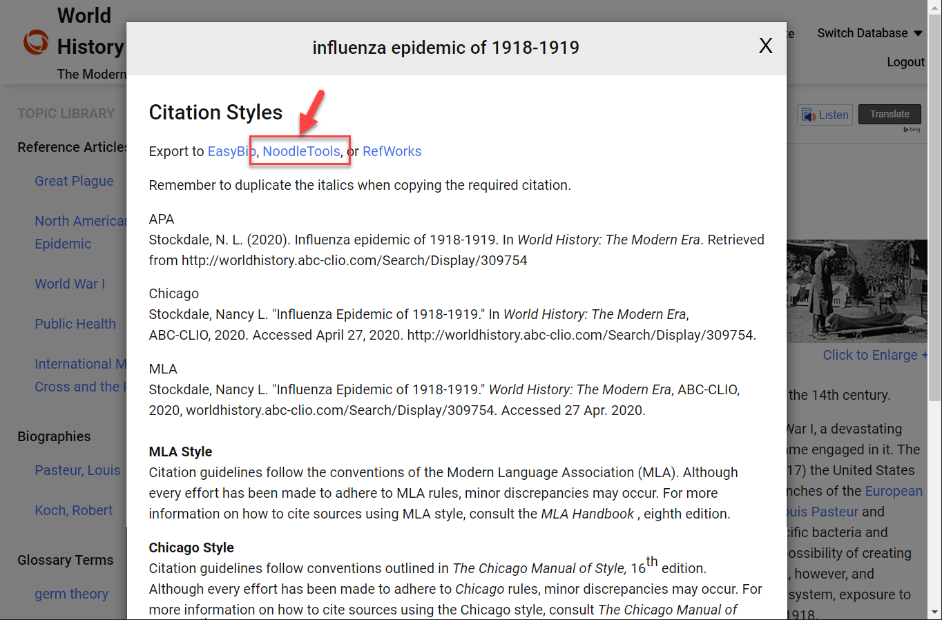 Clicking Cite will open an overlay window with citations displayed in multiple formats. Click the Export to… NoodleTools hyperlink at the top of that window to display the MLA, APA, or Chicago-style citation as it will be imported into the NoodleTools project.