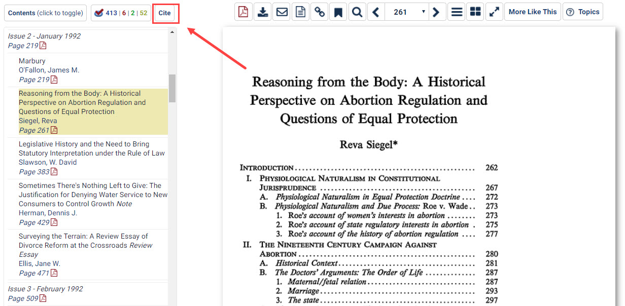 A HeinOnline user can easily a source from Law Journal Library. To begin, a student opens a NoodleTools project and locates a periodical article in HeinOnline’s Law Journal Library that they wish to use in their research. As pictured here, the built-in Cite button above the document launches the citation feature.