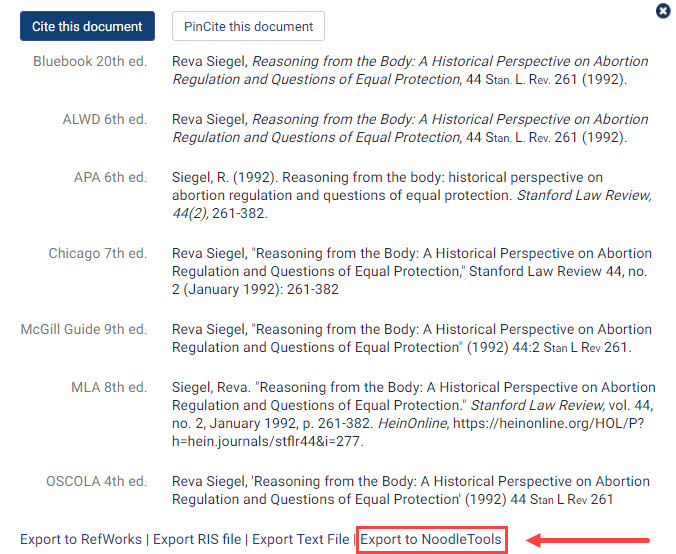 The Cite button brings up examples of citations for the document in various styles created by HeinOnline. Clicking the Export to NoodleTools hyperlink (pictured) displays the MLA, APA, or Chicago-style citation as it will be imported into the NoodleTools project.