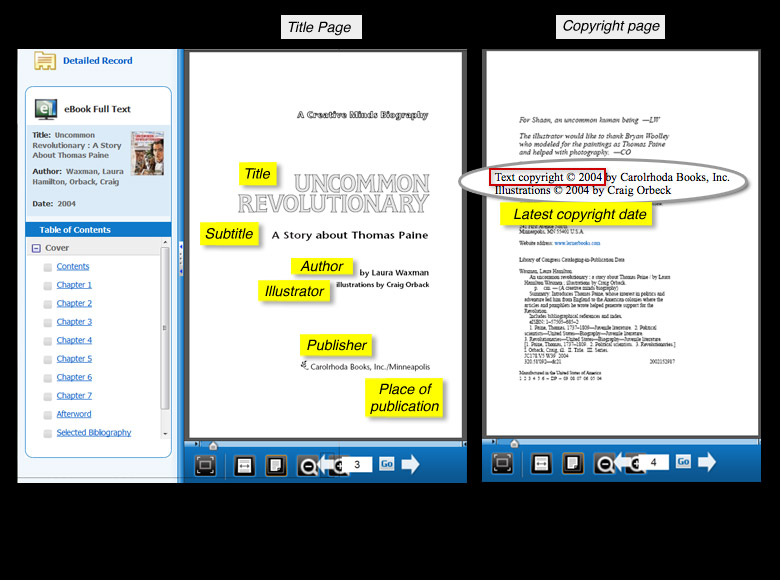 Use the title page and copyright pages (not the cover or jacket) to find: