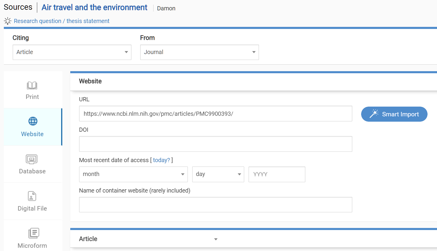 In this demonstration, we import a journal article citation from NIH’s PubMed Central website. Behind the scenes, we use their API to pull in accurate metadata, then apply careful post-processing to construct a perfect citation in the selected citation style.